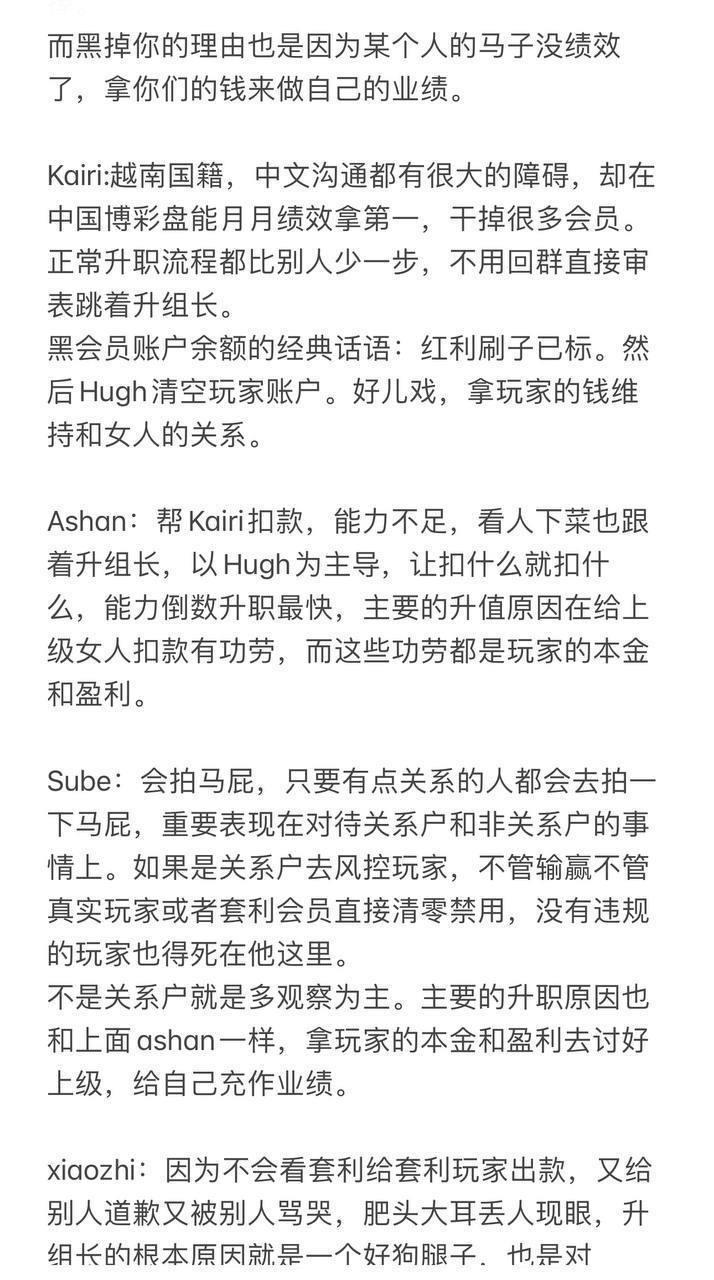 亚博旗下的开云等平台风控部门管理混乱,内部充斥着利益交换和贪污腐败现象。部门管理者利用玩家的本金和盈利作为垫脚石,以此填充自己的业绩,铺设升职的道路,甚至通过这些不义之财来中饱私囊,或与外部势力进行套利合作,支付保护费。